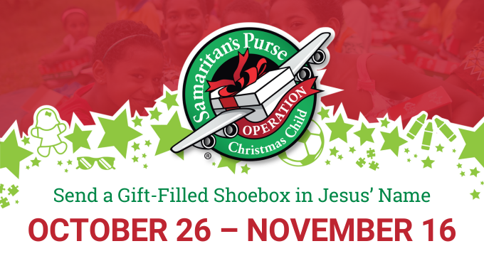 Our annual Operation Christmas Child shoebox collection in support of our ministry partner Samaritan’s Purse begins October 26! Pick up a shoebox at the display in the coming weeks, fill it with items from the provided approved lists of toys, school supplies, hygiene items. Return your box(es) by Sunday morning, November 16. Remember to add $10 per box for shipping which may be paid online or by including a check made out to Samaritan’s Purse.